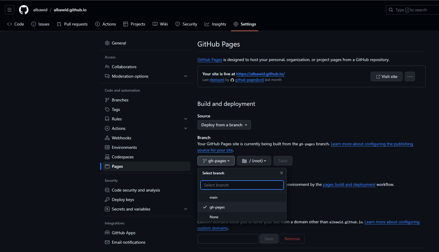 Kemudian ubah sumber website ke branch gh-pages dengan cara buka repository website Settings > Pages > Pilih gh-pages sebagai sumber.